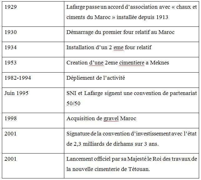 Lafarge depuis 1929 et à connu de grandes évolutions depuis cette date, en effet Lafarge Maroc est aujourd’hui leader du secteur cimentier avec 41% de parts de marché et regroupe quatre usine, Bouskoura, Meknes, Tétouan et Tanger.