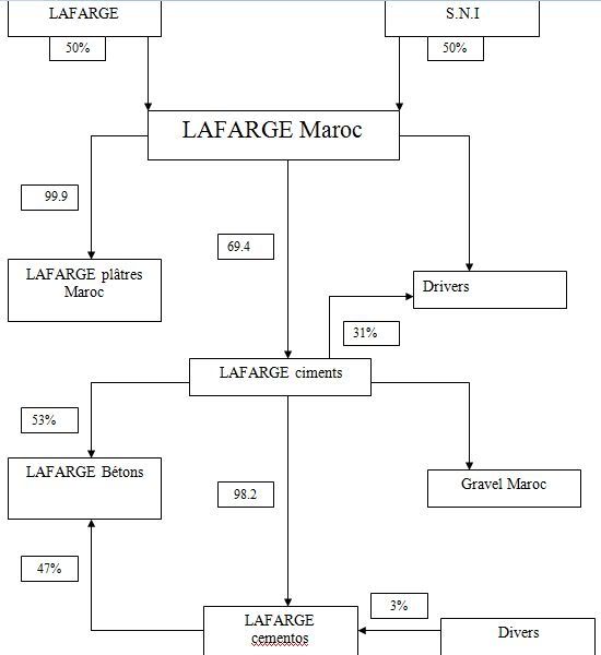 Lafarge Maroc regroupe aujourd’hui 4 sociétés cimentières jusqu’à la indépendantes et mono-usines cinonca, cadem, cementos Tanger, cementos Maroquins, il s’agit en fait de deux entités juridiques : Lafarge ciments (68%) cotée à la Bourse de Casablanca et Lafarge cementos.