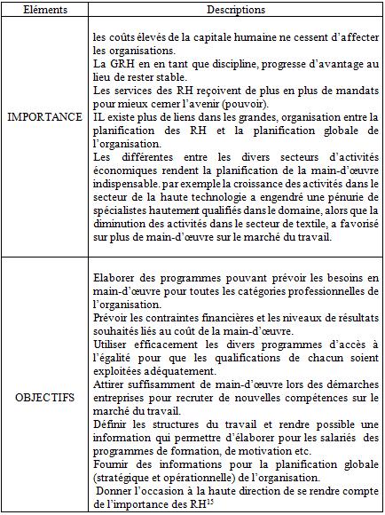 Enfin, les autres auteurs définissent la PRH comme « un ensemble d’activités qui permet aux dirigeants d’une organisation d’identifier, d’évaluer et de définir leur besoins en RH en tenant compte de leurs objectifs, de leurs programmes d’action et de développement à court, et long termes » cette définition ajoute un autre élément : l’identification des objectifs de l’organisation, mais afin d’être efficace la planification des RH doit également considérer les objectifs personnels de chacun.