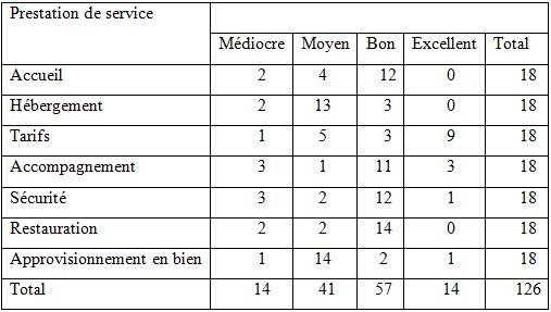 Les opinions des touristes sur un certain nombre de prestation de services qu’ils ont reçus et sur l’organisation du secteur à Imilchil et à Merzouga, ont permis d’établir le tableau suivant :