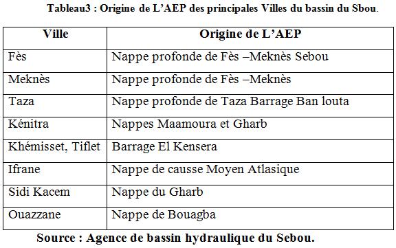 Tableau3 : Origine de L’AEP des principales Villes du bassin du Sbou.
