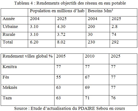 Tableau 4 : Rendements objectifs des réseau en eau potable