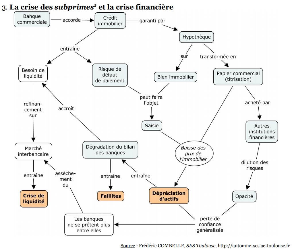 Le schéma suivant décrit l’enchaînement des effets liés à cette crise, et résume le lien entre le système d’octroi du crédit, la crise de liquidité et les faillites qui s’en sont suivies.