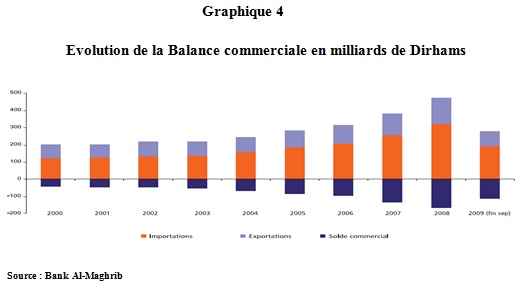 Par conséquent le déficit commercial alourdi en 2008 est en baisse et atteindra 109.8 milliards de dirhams à l’issue des neufs premiers mois de l’année 2009[1].