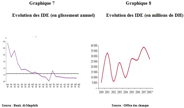 Après avoir été réduit de 21.5%, les IDE n’ont portés à fin septembre 2009 que sur un montant modeste de 17.4 milliards de dirhams. Cette contraction s’explique par la persistance des incertitudes et des difficultés de financement à l’échelle internationale et de l’éventuel report de projets d’investissements.