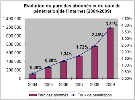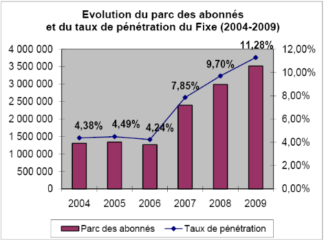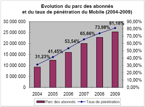Etat de lieux des TIC au Maroc : Numeric 2013, E-Learning, E-Gov, E-Commerce Le secteur des technologies de l’information et des communications (TIC) connaît une véritable explosion au Maroc. Les chiffres pour plusieurs indicateurs ont en effet galopé, et de nouveaux outils qui ont été développé dans ce secteur connaissent un essor remarquable. Ainsi, disposons-nous des dernières statistiques (de 2009) sur l’évolution des TIC au Maroc: II.1. Régulation et réglementation Le secteur des télécommunications est régulé au Maroc par l’ANRT (Agence Nationale de Régulations des Télécommunications) qui est une agence performante et autonome, crée en 1997 suite à des réformes et restructurations dans le secteur des télécommunications. L’ANRT est dotée de larges prérogatives. Le conseil des ministres a adopté trois décrets les renforçant davantage. L’objectif étant de renforcer la mission de l’ANRT, pour intégrer, outre la veille à la concurrence, la possibilité de trancher et arbitrer les litiges, afin de pouvoir évoluer dans un environnement concurrentiel loyal. Selon les dernières informations publiées sur le site de l’ANRT, le secteur des télécommunications se dote d’une nouvelle note d’orientations générale à l’horizon 2013.Il est également annoncée que L’ANRT a été désignée en tant que «Meilleur Régulateur Afrique du Nord» pour l’année 2009 lors de la dernière conférence d’Africa Telecom People (ATP), qui s’est tenue le vendredi 12 février 2010 à Paris. II.2. Opérateurs téléphoniques En plus des trois principaux opérateurs téléphoniques que sont Maroc Telecom, Meditelecom, Wana, le Maroc compte douze(12) opérateurs satellites fournissant chacun des services divers sur le marché des télécommunications. II.2.1. Maroc Telecom Maroc Télécom (إتصالات المغرب = Itissalat-Al-Maghreb), ou IAM, est la 1re société de télécommunications au Maroc. Privatisé par le Royaume du Maroc à partir de 2001, elle devient une filiale du groupe français Vivendi. 1) Historique § En 1999, L’ONPT, Office National des Postes et Télécommunications, est divisée en 2 entités séparées: la Poste Maroc et Maroc Télécom, cette dernière devient une société anonyme indépendante appartenant à 100% à l’Etat marocain. § En décembre 1999, acquisition de 80% du capital de Casanet, l’un des premiers fournisseurs d’accès à Internet au Maroc, qui a créé en 1995 le site Menara. § Le 20 février 2001, Vivendi a acquis 35% du capital de IAM, en obtenant l’appel d’offres international relatif à sa privatisation. § Avril 2001: Suite à l’appel d’offres international lancé par le gouvernement mauritanien, Maroc Télécom a acquis 54% du capital du groupe Mauritel, l’opérateur historique mauritanien, né en 1999. § Le 17 octobre 2001, Casanet est devenue une filiale à 100% de Maroc Télécom. § Décembre 2003, multiplication par 3 du chiffre d’affaires annuel de Casanet. Son activité est centrée sur des offres entreprises et la gestion de portails, dont le portail Menara. § Novembre 2004: Vivendi augmente sa participation à 51% du capital de IAM. § Décembre 2004: Maroc Télécom introduit une partie de son capital à la BVC de Casablanca et à la Bourse de Paris. § Décembre 2007: au terme d’un programme d’échange d’actions entre royaume du Maroc par l’intermédiaire de la Caisse de Dépôt et de Gestion ( CDG) du Maroc et Vivendi. ce dernier acquière 2% supplémentaires, ce qui porte ainsi sa participation à 53% du capital contre 30% pour la CDG. les 17 % étant détenu par le public coté en bourse de Bourse de Paris et de Bourse de Casablanca (2e place boursière d’ Afrique). 2) Activités Les chiffres consolidés à la fin juin 2008 comprenant les marchés du Maroc, France, Belgique, Mauritanie, Burkina Faso et Gabon. § Téléphonie mobile: 16,71 millions de clients. § Téléphonie fixe: 1,736 millions de clients. § Internet: 560 000 clients. 3) Filiales et participations § Mauritel (52 %) – Mauritanie § Onatel (51%) – Burkina Faso § Gabon Télécom (51%) – Gabon § Mobisud ( MVNO) (66% et 16% détenu par SFR) – France, Belgique § SOTELMA – Mali § Médi1Sat (télévision) (39%) – Maroc § Casanet ( FAI) (100%) – Maroc § Menara Portail FAI (100%) – Maroc 4) Indicateurs d’activités En 2008, Maroc Télécom a annoncé des bénéfices record en progression de 19,6% pour un chiffre d’affaires de 2,5 milliards d’euros. Bien que son chiffre d’affaires ne constitue que 10% de celui de sa maison mère Vivendi, les bénéfices représentent eux 25% du total, la rentabilité elle se situe à 44% ce qui a fait dire qu’elle défiait les lois de la pesanteur. 5) Concurrence Avec plus de 22,615 milliards de Dhs de chiffres d’affaires en 2006, Maroc Télécom est le leader historique sur le marché des télécommunications au Maroc avec plus de 60% de part de marché dans la téléphonie mobile, et près de 90% de part de marché en ce qui concerne la téléphonie fixe et l’Internet. Il partage le marché marocain, avec 2 autres opérateurs: Meditelecom et Wana Corporate. II.2.2. Meditelecom Meditelecom ou Meditel est le premier opérateur de téléphonie privée au Maroc. Médi Telecom s’est vu octroyer en août 1999 la deuxième licence GSM au terme d’un concours officiel de mise en candidature de sept compagnies de télécommunications. 1) Historique § Meditelecom fut créée en 1999 conjointement par Telefónica et Portugal Telecom qui en détenaient 32,18% chacun. § En septembre 2009, les groupes marocain Finance Com et CDG rachètent les parts de Telefónica et Portugal Telecom. 2) Actionnariat Le capital est composé de: Fipar Holding: 49,77 %, Finance Com: 37,18 %, RMA Watanya: 13,06% 3) Indicateurs d’activité § Parc clients Mobile (au 30 juin 2009): 8,634 millions (+21,9%) § Chiffre d’affaires 2008: 5,2 milliards de