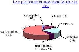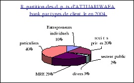 « Le 1er semestre de l’année 2005, s’est annoncée en forte hausse, le total bilan s’est établi à 115,76 milliards de Dh contre 101,19 milliards de Dh à fin juin 2004. En 2004, les crédits représentaient 43,5% du total actif, les prêts interbancaires ont beaucoup évolué, ils représentaient 13,8%de l’actif alors que les bons de trésors et assimilés n’était que de 17,7%. Grâce au positionnement important de l’ex-Wafabank, sur le segment de l’immobilier, la part de marché d’ Attijariwafa bank sur le segment des crédits immobiliers, a atteint 9 345 748 au 30/06/2005, contre 8 599 141 au 30/06/2004. Les créances sur la clientèle ont vu leur part augmenter de 46,3 au 30/06/2004, à 58,6 milliards de Dh sur la même période en 2005. En 2004, l’essentiel de la clientèle d’Attijariwafa bank été composé de sociétés privées, 57% des crédits distribués par la banque, ont été alloués à cette catégorie de clients; les particuliers occupaient le 2ème rang avec une part de 23% de l’ensemble des crédits distribués. Le graphique suivant, montre la répartition des créances clientèle nettes d’Attijariwafa bank en 2004.