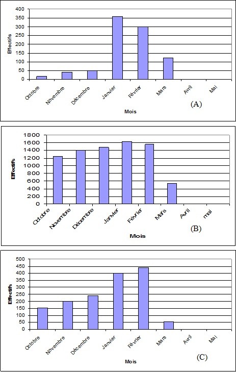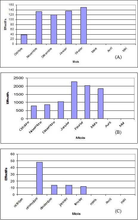 Une seule observation de 2200 individus était marquée durant toute la période d’étude. C’était durant le mois de janvier (Figure n° 24-A).
