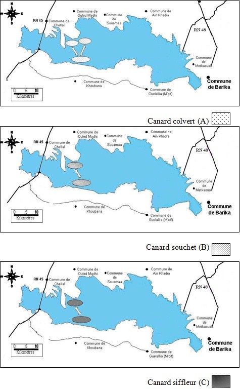 Figure n° 13. Occupation spatiale du Chott El Hodna par le Canard colvert (A), le Canard souchet (B) et le Canard siffleur (C)