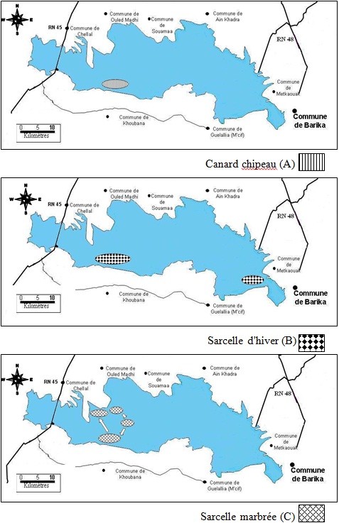 Figure n° 15. Occupation spatiale du Chott El Hodna par le Canard chipeau (A), la Sarcelle d’hiver (B) et la Sarcelle marbrée (C)
