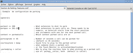 Figure22: Le fichier features.conf et la gestion du parking. Dans le fichier /etc/qsterisk/extensions.conf rajoutons cette ligne: Include=>parkedcalls En pleine communication composez le #200, et le serveur vocal vous communiquera un numéro compris entre 201 et 230. composez le numéro reçu à partir de n’importe quel poste et vous serez à nouveau en communication avec votre correspondant. Notez que le temps entre la demande de parking et la remise en communication (parking time) ne doit pas dépasser les 45 secondes, sinon la communication sera interrompue.
