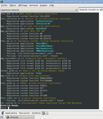 Notez que la source zaptel est utilisée pour configurer les cartes digium et accéder aux réseaux PSTN. Ce qui n’est pas notre cas. Pour démarrer Asterisk: /etc/asterik/# asterisk -vvvc
