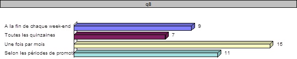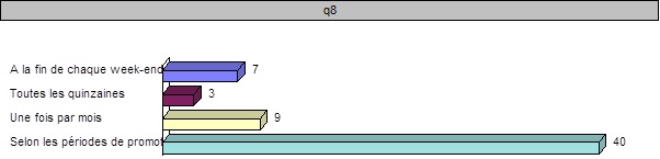 On remarque que 35,7% des sondés fréquentent les grandes surfaces une fois par mois, 26,2% selon les périodes de promotion, 21,4% à la fin de chaque week-end et 16,7% toutes les quinzaines.