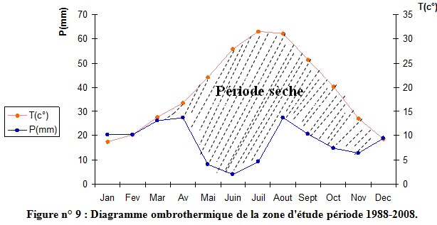 D’après la figure n° 09 la période sèche de la zone d’étude s’étend entre 9 et 10 mois du mois de Mars jusqu’au mois de Décembre.
