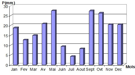 D’après le tableau n°03 nous marquons que le mois le plus pluvieux à M’sila est le mois de mai avec 27.52 mm, alors que le mois le moins pluvieux est le mois de juillet avec 4.19 mm. La région d’étude reçoit en moyenne 211.16 mm de pluie par ans. L’histogramme de la Figure n° 06 illustre l’irrégularité des précipitations.