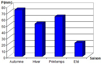Le tableau n°04 permet de caractériser le régime pluviométrique en fonction des saisons. Le régime saisonnier est de type APHE, ceci signifie que l’automne est la saison la plus arrosée alors que l’été est la saison la plus sèche (Figure n° 07).