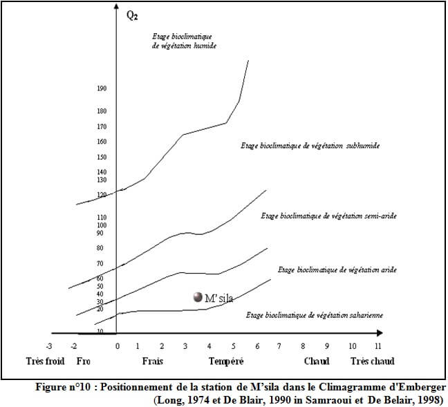 Figure n°10 : Positionnement de la station de M’sila dans le Climagramme d’Emberger (Long, 1974 et De Blair, 1990 in Samraoui et De Belair, 1998)