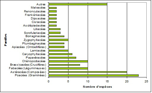 Apiacées, Plumbaginacées, Borraginacées avec 4 espèces, Scrofulariacées, liliacées avec 3 espèces, Asclépiadacées, Cistacées, Malvacées, Ranunculacées, Frankeniacées, Dipsacacées avec 2 espèces.