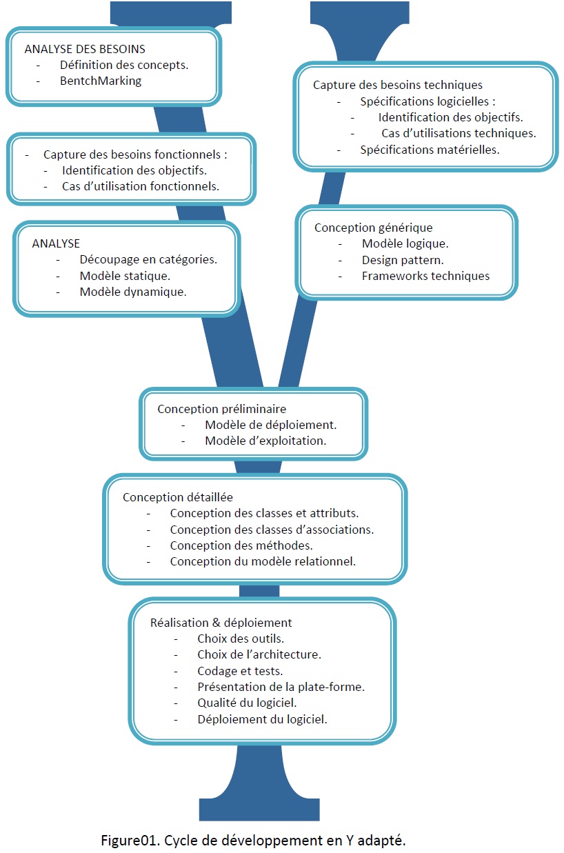 Pour ce faire nous avons choisi un processus de développement nommé « 2TUP » qui propose un cycle de développement en Y (voir figure). Nous avons choisis aussi le langage de modélisation UML qui se caractérise par le fait qu’il soit un langage formel et normalisé.