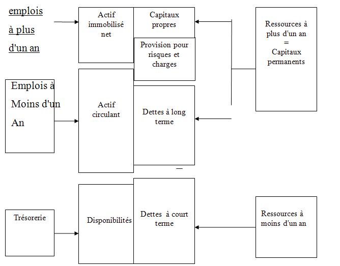 Deux grands blocs apparaissent:les capitaux permanents, regroupant les capitaux propres et les dettes financières à long ou moyen terme, et les dettes à court terme appelées encore passif circulant.