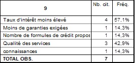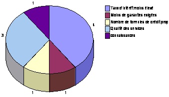 –         Processus d’octroi de crédit : obstacle pour la PME ? Processus d’octroi de crédit –         critères de choix de sa banque : critères de choix de sa banque critères de choix de sa banque Sur  la base  des réponses à l’enquête, les deux critères de choix d’une banque les plus importants sont les taux d’intérêt et la qualité des services. Le nombre de formules proposées par les banques ne pose plus de problème, puisque l’ensemble des banques offre des formules identiques pour le financement à court terme et à moyen terme des besoins de PME. –         les garanties : les garanties D’après notre enquête, on constate que la majorité des entreprises (71.4%) considère  que les garanties exigées par la banque sont justifiées à cause de l’aspect prudentiel des banques.