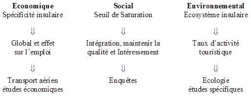 Des contraintes une nouvelle fois liées à l’exiguïté du territoire, à son isolement, et souvent à une faible population, doivent intervenir dans la construction du « modèle » sous peine de provoquer des effets négatifs, supérieurs aux effets positifs, souvent irréversibles par leurs conséquences sur l’environnement, par leurs effets sur les moeurs, la vie des populations insulaires, leur bien être physique, mental et social.