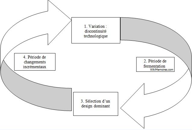 Cette perspective fut adoptée par M.L. Tuschman et P. Anderson pour étudier plus particulièrement l’effet d’un changement technologique. Ils proposent un modèle où quand il survient une discontinuité technologique, une période de « fermentation technologique » commence, jusqu’au moment où un processus de sélection conduit à l’adoption d’un design dominant. Puis, une phase de changements incrémentaux se produit. Ils vont conduire par la suite à une nouvelle discontinuité, variation.