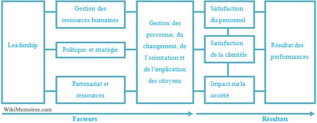 Les facteurs de production sont les suivants : le leadership, la gestion des ressources humaines, la politique et stratégie, les partenariats et ressources et enfin la gestion des processus.
