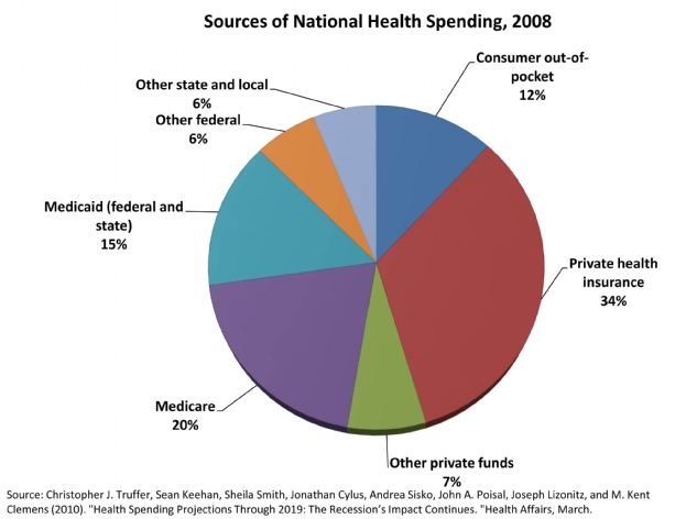 Dans les dépenses de santé, l’assurance privée a joué un rôle important puisqu’elle y contribue à hauteur de 34% en 2008. C’est bien plus que la plupart des pays de l’OCDE car les pays qui suivent les américains sont le Canada et la France avec une participation des compagnies d’assurances privées supérieurs à 10% des dépenses totales de santé.
