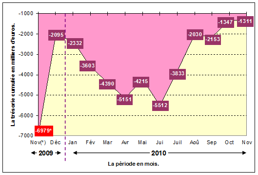 | La trésorerie cumulée (en milliers d’euros). | -6979* | -2095 | -2332 | -3603 | -4390 | -5151 | -4215 | -5512 | -3833 | -2030 | -2153 | -1347 | -1311 |