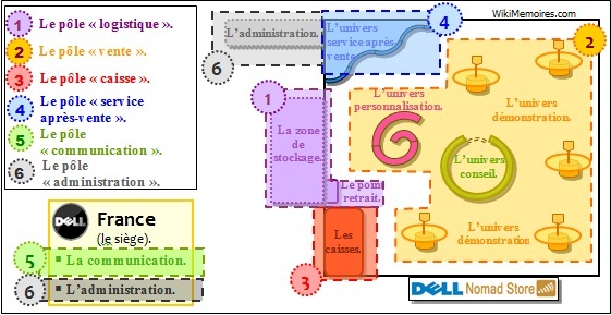 4.4.1.2 Les coûts prévisionnels des pôles d’activités. Nous avons fait le choix de calculer les coûts prévisionnels de l’activité du Dell Nomad Store Haussmann par pôle d’activité. Ceux-ci sont au nombre de six : les pôles « logistique », « vente », « caisse », « service après-vente », « communication » et « administration ». Tous ces pôles sont internalisés à l’exception du pôle communication et d’une partie du pôle administration qui sont externalisés, comme l’indique le schéma ci-après. La figure n° 49 : les différents pôles d’activités du Dell Nomad Haussmann.