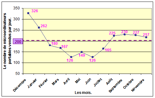 Sachant que l’univers dédié au microordinateur portable du magasin Surcouf Haussmann vend en moyenne 96 microordinateurs portables par jour sur une surface de 250 mètres carrés, nous estimons à 200 le nombre moyen de microordinateurs portables qui seront vendus par jour par le « Dell Nomad Store » Haussmann d’une surface de 600 mètres carrés, étant entendu qu’il existe une forte saisonnalité des ventes de microordinateurs portables dont le nombre par jour varie entre 126 (en avril et en juin) et 326 (en décembre), comme l’indiquent le graphique ci-après. La figure n° 48 : la saisonnalité des ventes de microordinateurs portables pour le magasin « Dell Nomad Store » Haussmann.