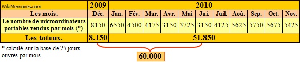 Sur la base de ces éléments, nous pouvons donc estimer à 60.000 le nombre de microordinateurs portables vendus pour l’exercice allant de décembre 2009 à novembre 2010 ainsi que le montre le tableau qui suit. Le tableau n° 10 : les ventes prévisionnelles de microordinateurs portables du magasin « Dell Nomad Store » Haussmann entre décembre 2009 et novembre 2010.