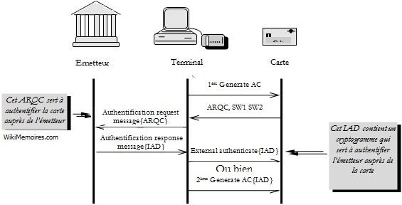 refusée offline : Le terminal émet à la carte une commande Generate AC pour lui demander un AAC. (c’est le même message avec b8, b7=0, 0). Cette AAC peut être présentée à l’émetteur comme preuve que la carte était présente durant la transaction). doit être exécutée online : Le terminal émet à la carte une commande Generate AC pour lui demander un ARQC. (c’est le même message avec b8, b7=1, 0). Cette fonction peut être exécutée à n’importe à n’importe quel instant durant la transaction, ça élimine le traitement non nécessaire. Par exemple si le bit « failure of cardholder verification » est mis à 1alors le terminal peut passer tout de suite à l’analyse d’action. Le terminal prend sa décision préliminaire en se basant sur le contenu du registre TVR, sur les préférences de l’émetteur et sur les préférences de l’acquéreur : 3 données « codes d’action de l’émetteur » peuvent être mises dans la carte, elles reflètent les préférences de l’émetteur en terme d’action à prendre suivant le contenu du TVR. 3 données « codes d’action de l’acquéreur » peuvent être mises dans le terminal, elles reflètent les préférences de l’acquéreur en terme d’action à prendre suivant le contenu du TVR. Le terminal traite les codes d’action en paires, par exemple :si pour une valeur donnée du TVR, l’un des 2 codes d’actions (celui de l’émetteur ou celui de l’acquéreur) propose le refus de la transaction offline, le terminal doit choisir le refus. et si l’un des 2 codes d’action propose le passage en mode online, l’émetteur doit respecter ce choix. La fonction « Card action analysis » : La décision de la carte, que ça soit online ou offline, est spécifiée par sa réponse à la commande Generate AC issue du terminal. Cette fonction est obligatoire dans n’importe quelle transaction, que la carte fait ou ne fait pas sa propre gestion de risque. La carte peut faire sa propre gestion de risque pour protéger l’émetteur d’une éventuelle fraude ou d’un risque de débit excessif. Comme résultat à cette gestion, elle prendra sa décision : achever la transaction en mode offline, en mode online, demander une consultation ou refuser la transaction. approuver la demande du terminal d’exécuter la transaction en mode offline, elle lui envoi un TC. exécuter la transaction en mode online, elle lui envoi un ARQC. demander une consultation (la carte soumet un message de conseille à l’émetteur lui informant d’une situation exceptionnelle), elle lui envoi un AAR. refuser la transaction, elle lui envoi un AAC. Lorsque cette fonction est achevée, le terminal mettra à 1 le bit correspondant dans TSI. N. B. : Un AAC peut indiquer soit le rejet de cette transaction, soit une restriction due à cet environnement. si, par exemple, la carte retourne un AAC avec les bits b3b2b1=001 du CID (cryptogramme information data), ça veut dire que la restriction est due à la carte. si le bit b4=1 du CID, le terminal doit envoyer un message de conseil à l’émetteur (PIN try limit exceeded, par exemple). La fonction « Online processing » : Cette fonction est exécutée suite à la réception du ARQC émis par la carte en réponse à la commande Generate AC. Une connexion est établie entre le terminal et l’émetteur à travers le réseau (mode online)ce qui permet à l’émetteur de revoir et d’autoriser ou rejeter les transactions qui sont en dehors des limites acceptable. Le terminal adresse un message de demande d’autorisation à l’émetteur. Ce message peut inclure l’ARQC de la carte. La réponse « message d’autorisation » envoyée par l’émetteur peut contenir des données d’authentification (étiquette 91). si la carte supporte ces données d’authentification (ça doit être indiqué dans le AIP), le terminal doit les renvoyer à la carte dans une commande External authenticate. Si la réponse de la carte est autre que SW1SW2=9000, le terminal est obligé de mettre à 1 le bit « Authentification was unsucceful ». si la carte ne supporte pas ces données d’authentification, ça voudrait dire que la carte a combiné la fonction d’authentification de l’émetteur avec la commande Generate AC, dans ce cas le terminal ne doit pas envoyer la commande External authenticate. si l’émetteur n’envoie pas des données d’authentification, le terminal n’émettrait pas la commande External authenticate. La carte ne doit pas exécuter plus qu’une seule commande External authenticate par transaction. Si le terminal lui envoi plus qu’une, elle doit répondre à la deuxième (et aux suivantes) par SW1SW2=6985. Après l’exécution de cette fonction, et si le terminal a émis la commande Generate AC il mettra à 1 le bit « Issuer authentification was performed » dans le TSI.
