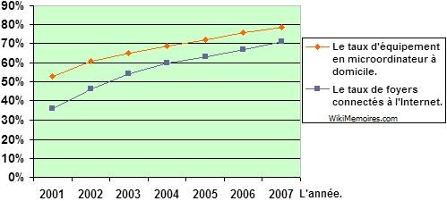 Ce taux devrait continuer à s’accroître avec le développement du haut débit, la France arrivant « en 3ème position en Europe derrière les Pays-Bas (74%) et la Suisse (69%) et à égalité avec le Royaume-Uni ». Il est constaté une même évolution en Allemagne où le taux d’équipement en microordinateurs au domicile est passé de 53% en 2001 à 78,6% en 2007 avec une augmentation des abonnements des foyers à l’Internet de 36% à 71% sur la même période. La figure n° 5 : l’équipement en microordinateur à domicile et les abonnements à l’Internet en Allemagne.