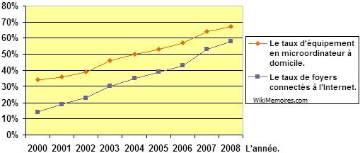 Familiarisées avec l’outil informatique qu’elles utilisent assez largement dans leur travail, les femmes viennent aussi plus nombreuses au microordinateur portable. Selon M. Yves Lagier, président directeur général de Surcouf, elles comptent pour plus de la moitié dans la clientèle des premiers modèles. Recherchant avant tout un matériel léger, peu cher et simple d’utilisation, elles ont été particulièrement séduites par le « mini microordinateur portable » dont l’esthétique plus originale était faite pour leur plaire. Désormais le taux d’équipement des femmes en microordinateurs portables est très proche de celui des hommes (27% pour les femmes contre 29% pour les hommes en 2008). D’une manière plus générale, le ralentissement de l’économie, associé à la réduction du pouvoir d’achat des ménages, explique le succès de ce nouveau modèle de microordinateurs portables auprès de tous ceux qui sont à la recherche du matériel le moins cher possible, aux fonctions limitées à leurs seuls besoins. 1.2.4.3 L’impact du développement de l’Internet. L’Internet est devenu, pour la majorité de la population une nécessité quotidienne, tant ses utilisations sont variées. Toutes les enquêtes montrent que le taux d’équipement des ménages en microordinateurs portables dépend directement du taux de foyers connectés à l’Internet. Ainsi le taux d’équipement en microordinateurs au domicile est passé de 34% en 2000 à 67% en 2008, suivant une progression parallèle à celui des abonnements des foyers à l’Internet qui s’élevait en 2007 à 58% contre 14% en 2000. La figure n° 4 : l’équipement en microordinateur à domicile et les abonnements à l’Internet en France.