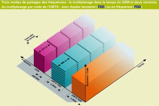 Fig 3.1 Représentation des différents modes de duplexage adoptés en UMTS et GSM Deux méthodes de duplexage sont connues pour séparer les deux sens de communication : Time Division Duplex (TDD) et Frenquency Division Duplex (FDD).