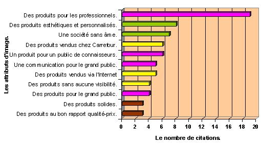 Acer bénéficie de la plus forte notoriété spontanée. Son image est n’est pas bonne (« c’est de la mauvaise qualité »). Toutes les appréciations vont dans le même sens (« ce sont les premiers prix en général », « il y a beaucoup de problèmes sur le suivi SAV », « ce sont des composants à faible durée de vie »). Le deuxième constructeur le plus connu est Apple. « J’en entends parler partout ». « Son image est basée sur la qualité ». Dell se situe en troisième position. A la différence des deux constructeurs précédemment cités, aux images opposées mais claires, l’image de Dell est ambivalente comme le montre le graphique ci-après établi à partir du verbatim illustrant l’image de Dell telle que perçue par le groupe réflexion. La figure n° 13 : les attributs d’image associés à Dell.
