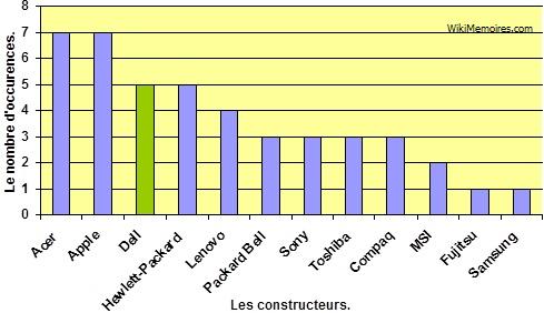 3.2.2.2 La perception du microordinateur portable. Le microordinateur portable apparaît avant tout comme un instrument de mobilité. Ce mot est le premier qui a été cité spontanément. La notion qu’il recouvre est celle qui est le plus souvent mentionnée. Elle l’est au travers des termes suivants : les mots « mobilité » (4 occurrences), « mobile », « nomade », « transport » et les verbes « emmener » (2 occurrences), « se déplacer », qui sont cités au total à dix reprises ce qui représente environ 15% de l’ensemble des mots utilisés pour ce thème. La mobilité est liée, dans l’esprit des répondants, aux caractéristiques techniques du microordinateur portable, à savoir sa « légèreté », son « faible encombrement », son « autonomie » et sa « connectivité ». Le microordinateur portable apparaît enfin plus comme un objet de plaisir, qui évoque les « vacances » et les loisirs (la « musique », les « films », la « vidéo ») que comme un moyen de travail. Il est à noter à cet égard que le mot « travail » n’est cité qu’une seule fois. Cette perception est à rapprocher d’un changement plus général dans le comportement des particuliers pour qui les déplacements et la mobilité sont désormais assimilables à la sphère des loisirs. 3.2.2.3 L’image de Dell et de ses concurrents. Le graphique qui suit présente la notoriété spontanée des différents constructeurs de microordinateurs portables. La figure n° 12 : la notoriété spontanée des constructeurs de microordinateurs portables.