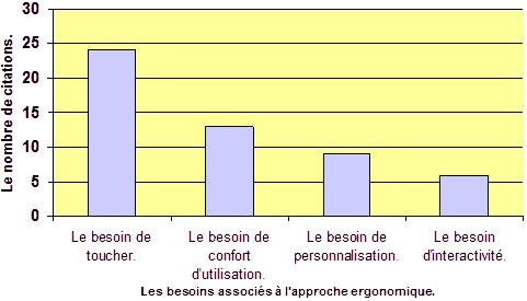 Le site marchand de Dell France pour le microordinateur portable ne répond à aucune de ces attentes. Il est perçu comme trop orienté vers les professionnels (« j’ai le sentiment qu’ils ne savent pas ce qu’est un particulier »), trop chargé (« trop de mots, trop de petit texte, beaucoup de texte »), mal organisé (« on se perd très vite dans le site »), doté d’un configurateur trop compliqué (« un configurateur efficace mais très difficile d’utilisation »), peu attrayant (« ça ne donne pas envie…c’est trop sobre ») et ne permettant pas une bonne visualisation des produits (« on ne voit pas clairement les produits que l’on achète »). L’ensemble de ces éléments semble confirmer notre hypothèse selon laquelle Dell France doit mettre en place un site marchand dédié pour le grand public. 3.2.2.6 L’approche ergonomique. L’approche ergonomique est perçue comme une réponse à des besoins non satisfaits. Ces besoins sont manifestés par l’emploi répété des segments « je veux » (avec 15 occurrences, ce segment est le second par le nombre d’occurrences) et « j’aimerais » (4 occurrences). Ces besoins sont de nature différente comme l’indique le graphique qui suit. La figure n° 20 : les besoins associés à l’approche ergonomique pour ce qui est du microordinateur portable.