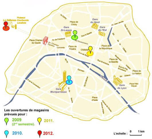 Compte tenu du nombre de consommateurs potentiels à Paris et dans l’agglomération Parisienne, nous proposons d’installer à Paris et dans sa proche banlieue trois autres magasins dans des zones répondant aux critères d’implantation optimale des points de vente que nous avons définis (les quartiers de l’Hôtel de ville de Paris, de Montparnasse et de La Défense,).
