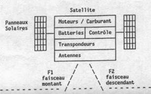 Figure 2.2 Schéma d’un satellite. Lorsqu’un signal est émis depuis la Terre vers le satellite, ce dernier reçoit ledit signal sur un transpondeur donné (identifié par la fréquence du signal émis, fréquence d’uplink F1). Pour simplifier, disons qu’un transpondeur (aussi noté tp) est un canal. Le satellite démodule le signal, le déphase du bruit de fond qui l’accompagne et le remodule à une autre fréquence (fréquence de downlink F2) en général plus basse que F1 pour inhiber le phénomène d’échos puis envoie ce signal vers la Terre grâce à une de ses antennes. Un transpondeur est identifié par ses fréquences d’Uplink/Downlink, par sa polarisation (horizontale, verticale, circulaire droite, circulaire gauche). Il a une certaine largeur de bande.Chaque satellite à un certain nombre de transpondeurs (16 pour Eutelsat 2F1, 20 pour Hotbird 2, 3 et 4) 2.3.2 Les antennes Le satellite comporte également des antennes et des dispositifs électroniques. Les signaux sont reçus et retransmis par des composants appelés cornets, montés devant ces grandes antennes paraboliques. Le faisceau directionnel peut être axé sur une zone ou un pays déterminé à condition de choisir avec soin la fréquence, la forme et les dimensions des antennes paraboliques. Beaucoup de progrès ont été réalisés sur les antennes des satellites en vue d’économiser les ressources d’amplification, le gain nécessaire consommant effectivement beaucoup d’énergie. La zone de couverture des antennes est ainsi ajustée à la mission demandée, selon que l’on désire desservir de grandes zones comme les États-Unis ou bien des plus petites comme le Luxembourg. En effet, il apparaît inutile d’utiliser une large couverture pour une zone peu étendue, d’autant plus qu’un faisceau étroit permet d’offrir plus facilement un gain élevé. 2.3.3 Secteur terrien Equipements identiques