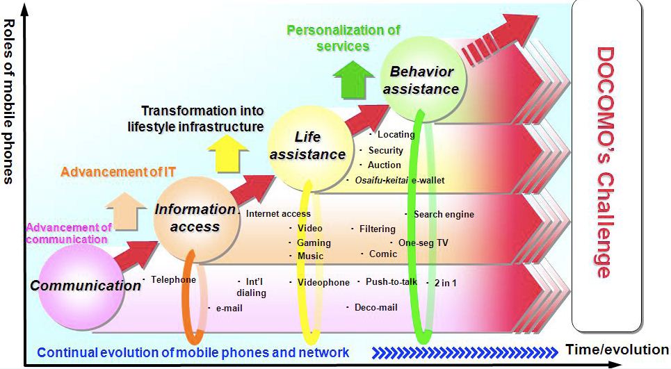 Voici les grands axes de développement selon NTT DoCoMo, premier opérateur Japonais qui à toujours eu un rôle moteur dans les grandes innovations du marché de la téléphonie mobile au Japon.
