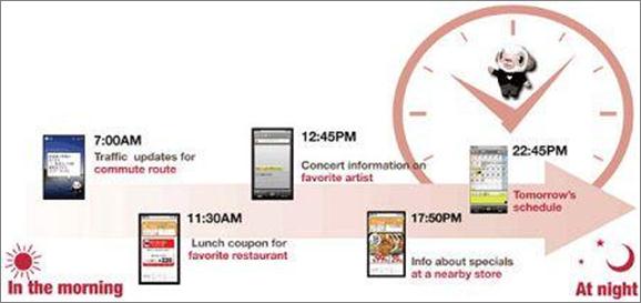 Le troisième axe, « Life assistance » correspond à l’intégration du mobile au quotidien des utilisateurs à l’aide d’outils capables de les assister et de répondre à leurs besoins comme Mobile Felica (NFC), GPS…