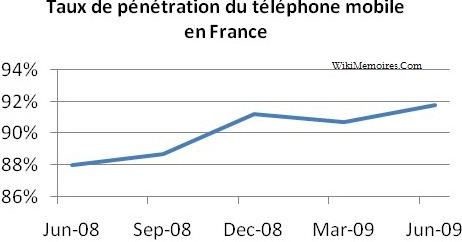 Après avoir connu un recul en mars 2009, le taux de pénétration du téléphone mobile en France a atteint 91,8% en juin 2009 (contre 88,1% en juin 2008) ce qui représente un parc de près de 59 millions d’abonnés selon un communiqué de l’ARCEP paru en août 2009.