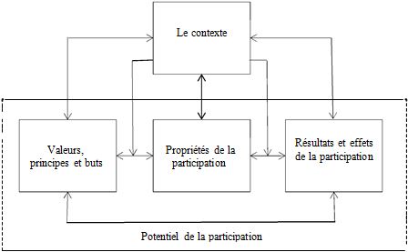 Cela dit, le modèle qu’ils ont développé a mis en lumière l’ensemble des dimensions de la participation et leurs interdépendances. Plus précisément, et tel qu’illustré dans le schéma ci- joint, ils comptent quatre grandes dimensions : la première représente les valeurs, les principes, les buts de la participation; la seconde se réfère aux propriétés de la participation; la troisième est le contexte, les frontières dans lesquelles la participation se développe; et la dernière inclut les résultats, les effets de la participation. Définie par l’ensemble de ces dimensions, la participation, est donc, selon Dachler et Wilpert (1978), le produit d’un système social complexe et dynamique.