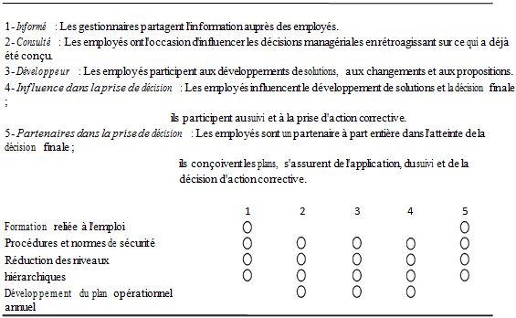 * Partenaires dans la décision : Les employés sont un partenaire à part entière dans l’atteinte de la décision finale; ils conçoivent les plans, s’assurent de l’application, du suivi et de la décision d’action corrective.