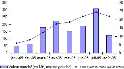 Le marché du système européen des quotas d’émission a tout d’abord connu une croissance très importante, ayant gagné près de 400%, en termes de valeur, au cours des premiers mois de fonctionnement. En effet, alors que le prix du quota était inférieur à 8 € au début de l’année 2005, il a pratiquement atteint 30 € au début du mois de juillet 2005, suivant l’envolée des cours du pétrole et du gaz. Le prix moyen de la tonne évitée sur l’année 2005 s’établit autour de 15 €.
