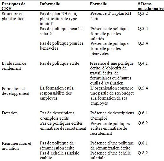 Dans les prochains paragraphes, nous présentons la manière dont nous concevons chacune des pratiques de GRH mises à l’étude ainsi que les principales informations que nous désirons recueillir à l’aide de notre questionnaire. La recherche étant réalisée en partenariat, il faut savoir qu’une partie de l’instrument de mesure est issue de la requête des différents acteurs impliqués. Le mandat principal étant de dresser un portrait des pratiques de GRH, nous avons abordé chacune des pratiques de manière générale. Le but n’est pas de se concentrer sur une pratique en particulier, mais plutôt de dresser une vue d’ensemble sur la GRH dans les entreprises d’économie sociale.