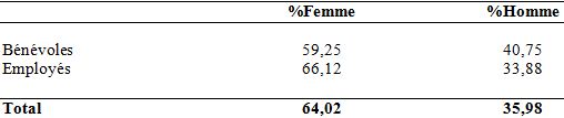 D’abord, nos données nous confirment le fait que le secteur est majoritairement féminin. Que ce soit chez les employés ou chez les bénévoles, la présence des femmes est supérieure à celle des hommes (Tableau 3.6).